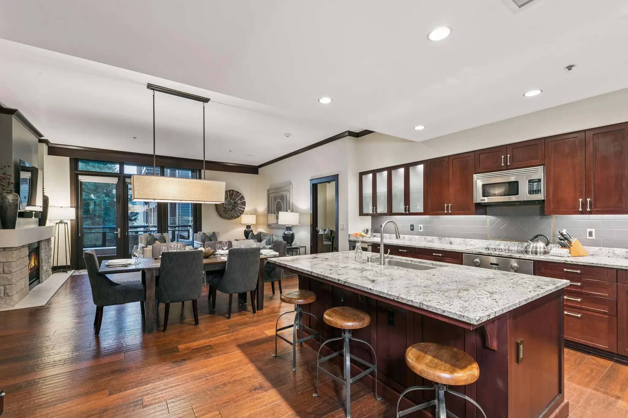 Enjoy a movie or board game together on the comfortable leather sectional couch, after a great ski day, or sit down for an intimate family dinner.